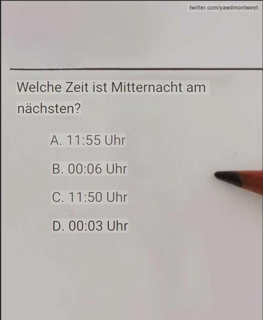 Darüber hinaus regte die Formulierung der Frage die Teilnehmer dazu an, kreativ zu sein.Die Abfrage, die mehr als 1,4 Millionen Mal angesehen wurde, bot vier Optionen: A. 11:55 Uhr, B. 12:06 Uhr, C. 11:50 Uhr und D. 12:03 Uhr. Viele Benutzer schienen verblüfft und äußerten verschiedene Antworten in den Kommentaren.